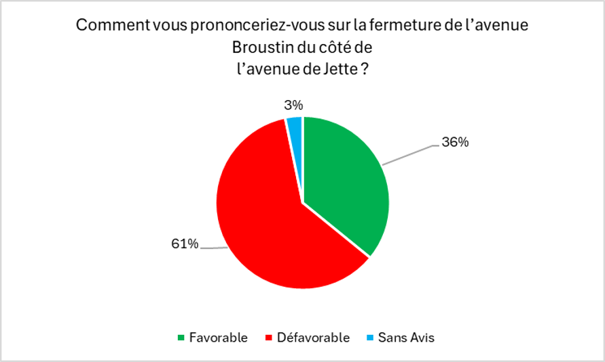 En effet, 68,5 % des riverains de la zone d’enquête ont indiqué être défavorables au projet dans sa globalité et 63,7 % des répondants sont opposés à la fermeture de l’avenue Broustin.